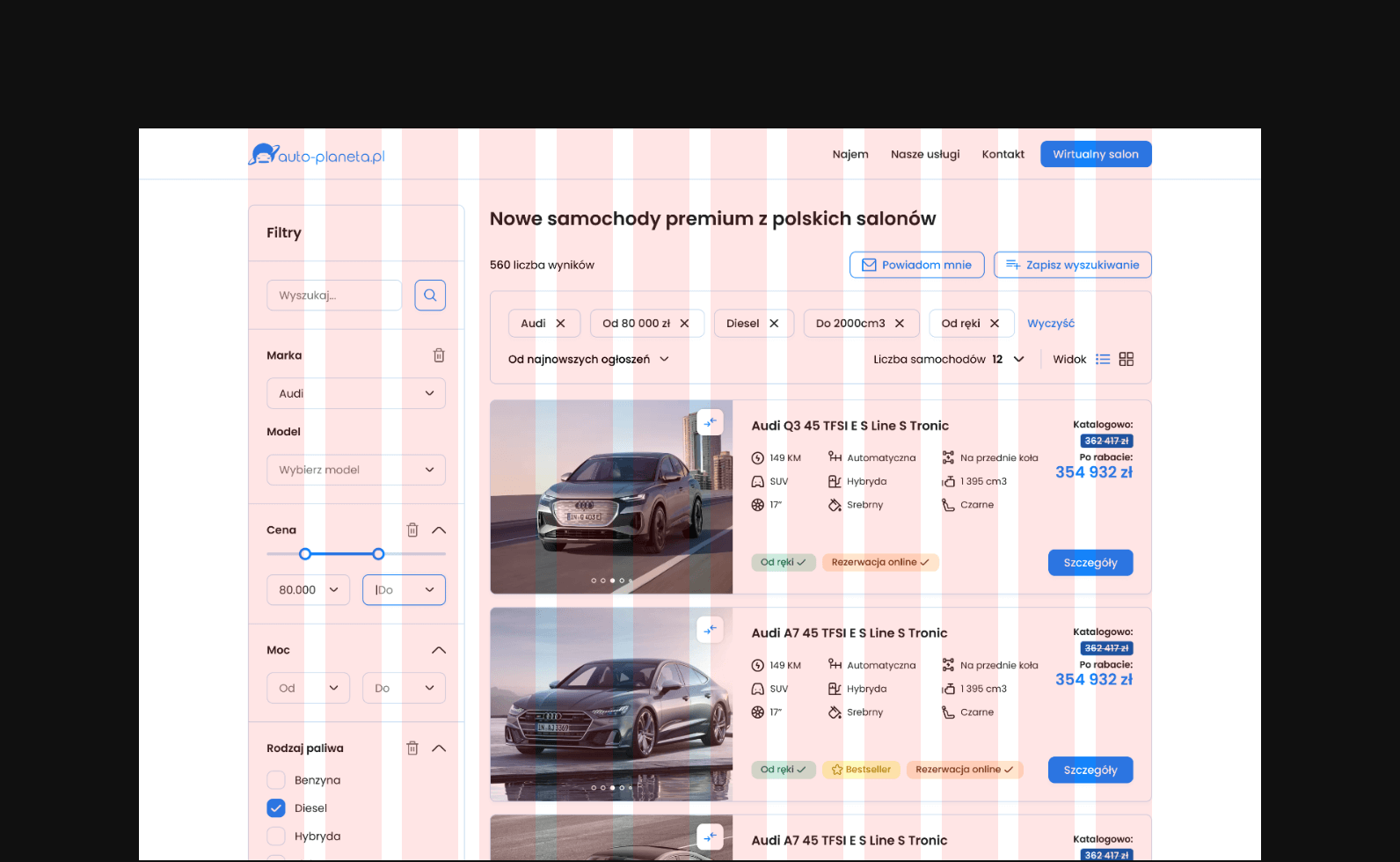 Zaproponowane przez nas rozwiązanie jest innowacyjne, różniące się delikatnie stylistyką od części poświęconych pozostałym markom, jednocześnie nie odbiegające od ogólnej koncepcji witryny.
