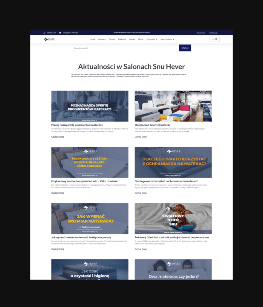 Wyjątkowo wygodny sklep internetowy połączony z konfiguracją materacy i bazą wiedzy o higienie snu. Projekt powstał z myślą o prostocie, intuicyjności i estetyce, przy zachowaniu wysokiej jakości prezentacji produktów.