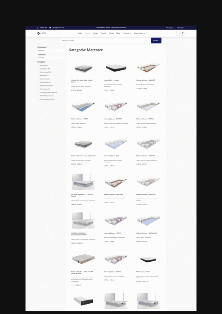 Wyzwanie polegało na stworzeniu sklepu internetowego, który nie tylko prezentuje produkty, ale również edukuje klientów i umożliwia konfigurację materacy dopasowaną do indywidualnych potrzeb. Kluczowe było maksymalne uproszczenie procesu zakupowego i utrzymanie estetyki strony.