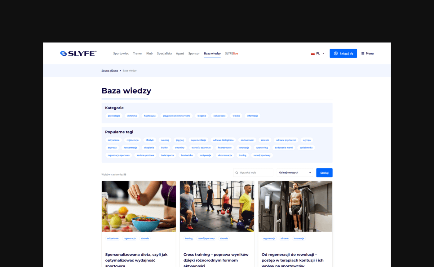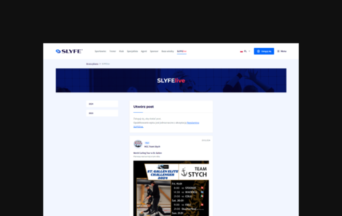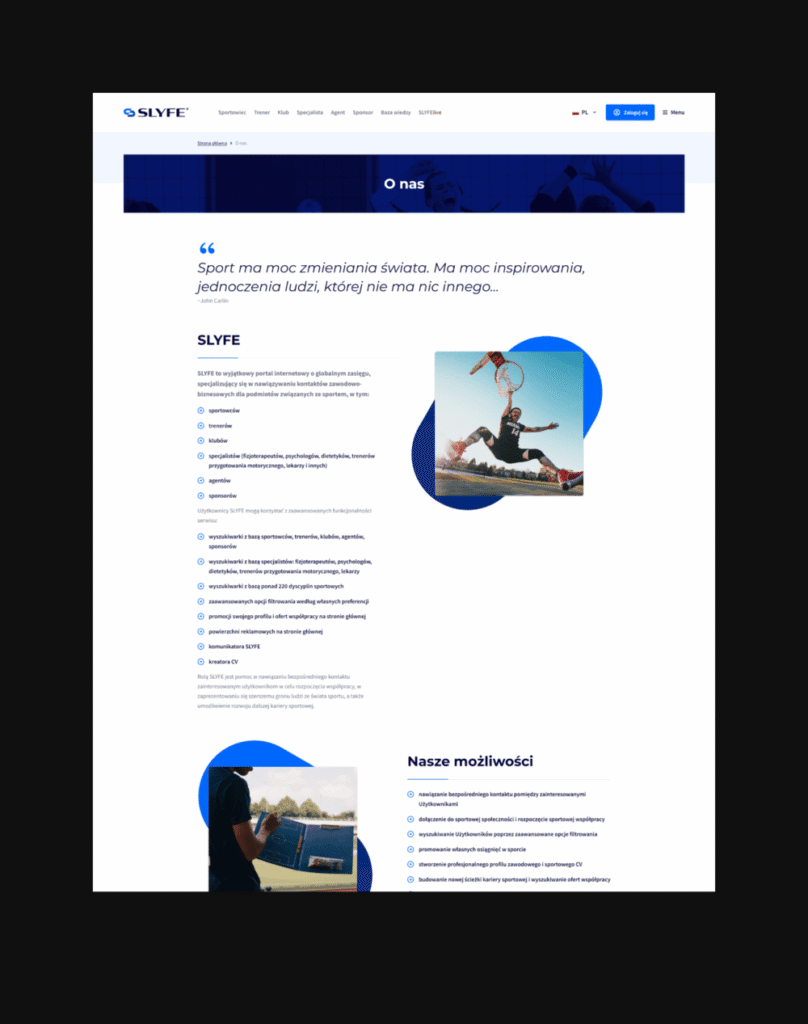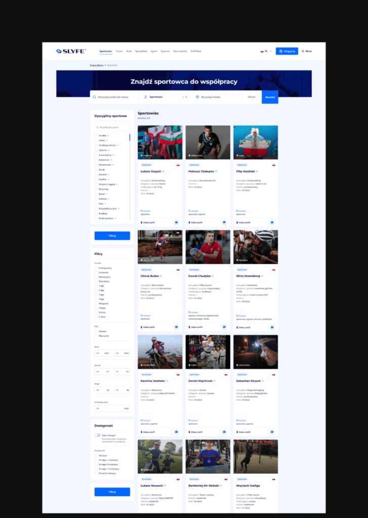 Portal Slyfe zrzesza sportowców, trenerów, menedżerów i sponsorów, umożliwiając im szybkie i proste nawiązywanie kontaktów. Naszym zadaniem było połączenie dużej ilości treści, tabel i porównań z prostym, nowoczesnym designem. Efekt? Intuicyjna platforma, która w przejrzysty sposób wspiera rozwój kariery sportowej i zawodowych relacji.